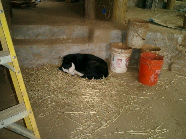 Here's a shot of the small built in bench, on the north side of the living room. the woodstove will go right where the hay bale is now